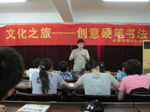7月21日上午,市上城区小营街道社区文化活动中心正在举办“文化之旅”创意硬笔书法活动。街道各社区学校的初小学生手握美工刀,发挥自己的想象,将冰棍棒制作成各式各样的笔,为书写创意书法做准备。浙江大学教育学院2010年赴小营街道暑期社会实践团的大学生们也一道参加了活动。