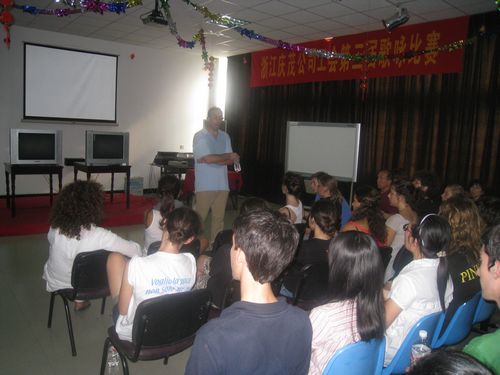 下午,意中师生乘车来到浙江庆茂纺织印染有限公司,受到公司相关人员热情的接待。浙江庆茂纺织有限公司是由香港庆业集团在大陆投资的一家全资子公司,该公司与意大利有着一定的合作关系,其引进最为先进的意大利产喷气织机,以期依托高科技来取得高效益。厂方请来了曾帮助其组装、调试机器的意大利工程师尼古拉先生为意中师生作专业的解说。在厂方人员的带领下,意中师生按照制作一匹布的流程(纱线-上浆-织造-整经--退浆-丝光-定型-预缩)对工厂进行了参观。中国传统印染工艺与现代高科技手段的结合引起了意中学生的连连感叹与浓厚兴趣。