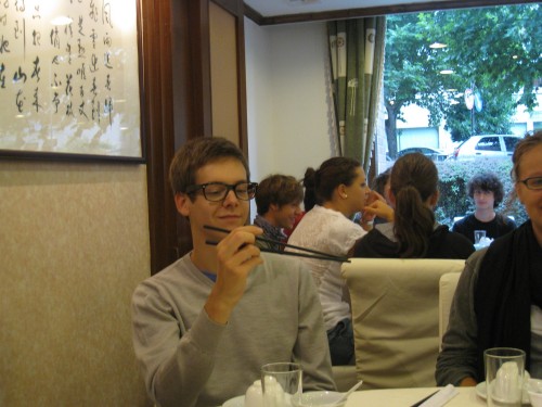 第一小组的同学们为接待工作做好了充分的准备,每位同学很快就顺利地与与2~3名意大利学生结对,并将其接待至事先安排好的房间休息。午餐时间,在中国同学的指导与帮助下,意大利同学们开始首次尝试用筷子品尝中国食物,并对中国筷子的使用和中国食物表现出浓厚的兴趣。席间,意中学生还进行了进一步的交流。为了消除旅途的劳累、调整时差,餐后意大利学生陆续返回各自房间休息。晚6点,晚餐迎接会在留学生食堂一楼举行,正式欢迎意大利学生的到来。比之午餐,晚餐期间意学生能更熟练地使用筷子,而意中学生的交流也更为广泛与深入。