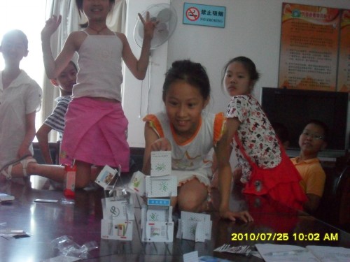 今天又是一个炎热的夏天,而且又是炎热的星期天,但这并阻挡不了社区内孩子们参加活动的热情。活动原定于9:00开始,但很多小朋友都提前到场了。有7个大学路社区小朋友参加了此次活动。活动在浙大大学生方晓婷和黄桂根的主持下开展。9:00,活动开始,我们要求小朋友们自己利用手中的扑克牌和剪刀,剪出一个自己喜爱的艺术品。当然,整个过程由方晓婷全程指导。