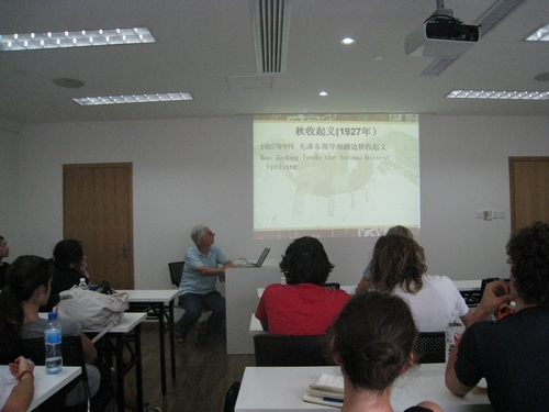 在王力老师简要地介绍完从1840年至1919年的中国历史后,Socol教授接着对1919年后的历史进行了简要解说,内容包括北伐战争、抗日战争、解放战争以及建国以后社会主义现代化建设。Socol教授向意方师生介绍到,在社会主义现代化的建设过程中,出现了“大跃进”运动和人民公社化运动等急躁冒进的错误,甚至出现了“文化大革命”那样全局性的、长时间的严重错误。幸而以邓小平同志为核心的党中央领导及时终结了这场错误,吹响了改革开放的号角。“文化大革命”引起了意方学生的高度关注,作为来自文艺复兴发源地的学生,意大利同学对于“文革”表示难以理解,并为那些消失在文革中的中国文明感到惋惜。