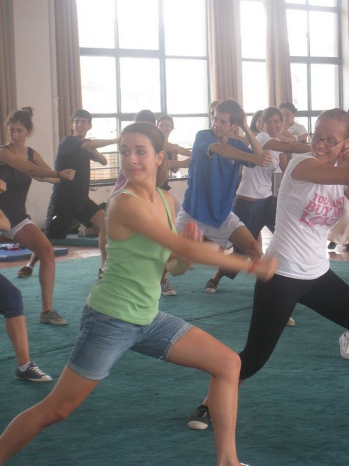 上午,吴剑老师率领吴雪霜等三位民传学生为意中师生献上了精湛的武术表演,赢得意中学生的连连叫好,现场掌声不断。随后,在这四位武林高手的指点下,意中学生学习了三种典型的中国功夫:一是以姿势舒展大方,动作灵活快速,刚柔并济,快慢相间,动迅静定,节奏分明为特点的长拳;二是以套路短小精悍,结构紧凑,动作朴实,手法多变,步法稳健,攻击勇猛,技击性强为特点的南拳;三是与养生息息相关的太极拳,特点为以柔克刚,以静待动,以圆化直,以小胜大,以弱胜强。意方学生学习中国功夫热情相当高涨,恰似杭城酷暑的温度。对于这三种不同风格的武术,每一位学生都投入了十二万分的努力,不敢有丝毫懈怠,尽管意方学生之前并未接触过中国功夫,但是学做起来,有板有眼,完全不像新手。而练中国功夫的时候,往往需要同伴的配合和帮助,因此意中同学有了更多的互动和交流。