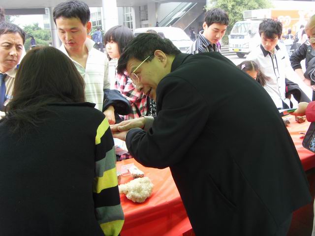 本次矿石化石展为我校师生展示了许多颇具研究价值的珍品,包括具有上亿年龄的古生物化石,诸如陆龟、叠层石、恐龙蛋等,不仅为同学们带来别样的视觉感受,而且充实了同学们的古生物乃至古地史的知识,更加深了大家对地球发展史的了解和兴趣;更有很多漂亮的矿石,如紫水晶、玛瑙、翡翠等,鲜艳夺目的色泽,千奇百怪的形状,吸引了许多人的目光;当然还有一些精雕细琢的宝玉石,制成了精美的挂件、精致的手链、纯朴古老的化石配件等等……现场指导的几位老师,总是面带微笑、聚精会神地为同学们讲解每一件矿物的形成机理、结构特征以及认识方法,借用科学真理之手揭开了它们神秘的面纱。老师们简练的语言、通俗的讲解吸引了许多同学驻足倾听。