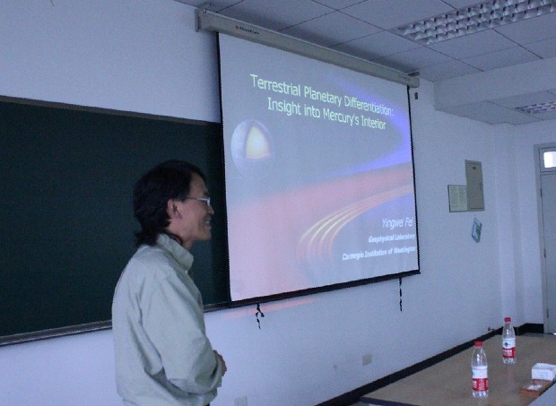 费英伟学长非常亲切和蔼,开场白就征求大家的意见用中英文参半进行交流,他鼓励同学们学习英语除了考试更要注重交流,英文讲座和报告可以帮助提高英文应用能力。费博士给大家带来的是一场关于类地行星的知识盛宴。寻找一个类地行星是一项有趣而又富有挑战的使命,而作为与地球构造最相似的水星因为离太阳近致使宇宙飞船很难接近它。今年3月份,美国2004年发射的飞船用了将近7年的时间才成功进入水星轨道,为科学研究带来契机。费博士从类地行星的组成化学成分、类地行星与太阳之间的距离、地球内部结构、模拟行星内部结构等方面来给大家一一介绍他和实验室的水星研究进展,并着重对水星内存在的Si、 Fe元素的分析做了阐述,让大家对水星有了更一步的了解。演讲结束后,费博士对师生们的提问作了详细认真的解答。