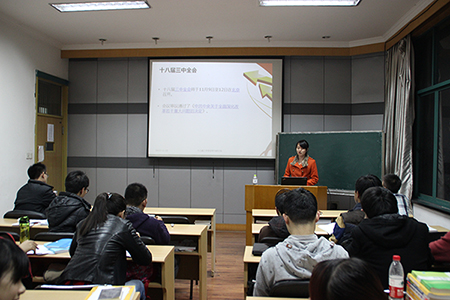 最后上台展示的是吕东杰同学,他负责展示四个议题中最为宽泛、最为复杂的经济体制改革。他的展示全面、分类合理、逻辑清晰,通过展示同学们了解到十八届三中全会在经济体制改革方面主要包括三部分内容:坚持发展基本经济制度;加快完善市场体系;建设开放型经济新体制。同学们表示非常有收获。