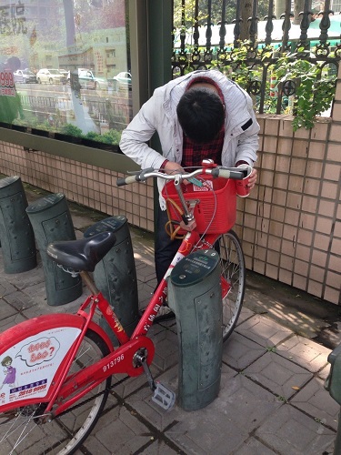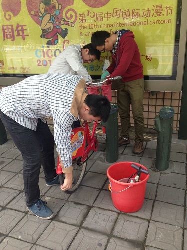 能源系团委的组织号召下,系11级本科生每班轮流排除志愿者服务队前往公共自行车服务点进行志愿者服务。按照工作日程,本周末轮到低温1101班进行志愿服务。团支书在和低温1102班团支书黄小清同学交流后,并实地考察发现最近周末各个公共自行车服务点在周末并没有积存过多车辆,最终共有8位同学参加了这次的志愿服务。3月30日早晨9点,一行人拎着各种装备,兴高采烈的前往了新桥门附近的公共自行车服务点。服务点的公共自行车并不多,我们8人快速地分好了工作,4人在5198号服务店清洁自行车,4人前往不远处5199号服务店工作。我们所有停靠的公共自行车用湿抹布进行了清洁,车架、车身、座位、扶手、龙头等没有一处逃离我们的清洁行动。我们还用铁丝球、美工刀对车身上和车兜内的小广告开展了歼灭行动,不得不说,小广告是本次清洁行动中最大的难点。这些小广告死死的贴在车上,通常清理一辆车的小广告需要5-10分钟,可即使清洗过后,还是能够看出小广告粘贴过的痕迹。在此,我们不得不说,为了城市的整洁,请不要随意粘贴小广告。除了这些,我们还为车胎打足了气。解决完新桥门这里的车子后,我们又赶赴5370号服务点。虽然清洁的过程很是辛苦,但是几个人边劳动,边谈笑,时间过去的很快。