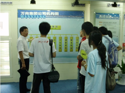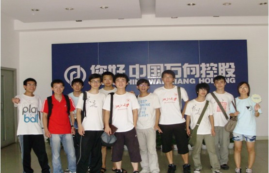2010年8月11号,能源工程学系暑期赴萧山万向集团参观实践团一行10名同学从玉泉校区出发,前往杭州萧山开展社会实践活动。万向集团始创立于1969年,位于国家级经济开发区——杭州市萧山区经济技术开发区。1990年起为浙江省计划单列集团,1997年起为国务院120家试点企业集团,1999年起被列为全国520户重点企业。