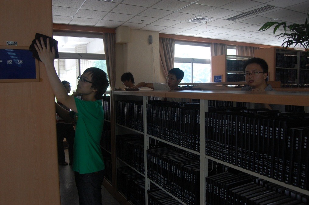 本周日上午我们一行8人按照计划时间,9:00准时在浙江省图书馆内休息厅集合完毕后,一起前往了我们此行的志愿者服务站—盲人图书馆,负责接待我们和给我们分配服务任务的是盲人图书馆的陈老师。由于任务比较多,陈老师将我们8个人分在了两个区域,四组人员一起分工完成各项任务,其中五人被安排在了盲人电子阅览室,李燕被安排负责录入盲人节活动的名单,曾磊赟和刘联鋆则负责为盲人书册分册录入目录,而李博和郭俊良则负责电子阅览室内的卫生工作;其他三人(郗丹、闫科、樊立安)则安排在外区负责书架的卫生工作。认清各自的分工后,大家都开始紧张的忙碌了起来,一个个不是埋头在电脑前就是拿着抹布在清理书架和窗台。