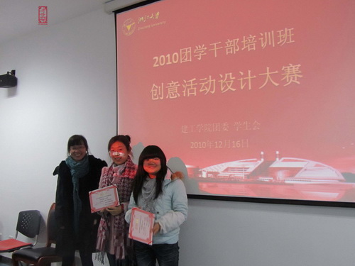8点30分,成员们都出色的完成了今天的展示,活动进入统分环节,与此同时分团委主席吴侃为同学们今天的表现做总结发言,先肯定了同学们的创新设计,但她还指出活动中存在的许多不足,同时还和同学们面对面的交换意见,场面十分热烈。十分钟后,本次大赛的一二三等奖已经出炉,他们分别是一等奖张佳敏团队,二等奖王志中团队,三等奖杨彧同学和关天杰团队,评委们依次为他们颁奖,和他们合影留念。