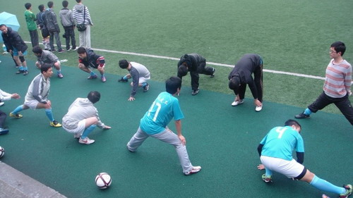 虽然今日天气阴有小雨,场地比较湿滑,但是球员们士气高昂,临开场近半个小时便在场边做着准备运动,脸上的表情显得非常轻松,这种精神状态同样感染了场边的拉拉队和记者们,令我们对今天的比赛充满了乐观的期待。