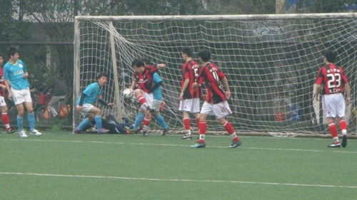 10:55,比赛正式开始,由控制系发球。经过一番脚下争夺,我方很快夺得控球权,在开场仅两分钟内即发起两次有力进攻,给对方造成了不小的压力。开场11分钟,我方球员盘球至门前,猛的一脚抽射,可惜被挡出,跟进队员迅速冲至门前补射,经过一番稍显混乱的争夺之后,终于破网进球,这也拉开了我方大举进攻的序幕。