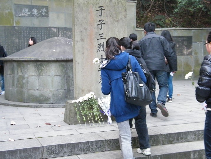 11月27日上午七点半,全体成员热情洋溢地集合在曹光彪楼下。尽管来自不同的年级,不同的实验室,但怀着共同的爱国热情亲切地交谈着。八时许,我们来到了万松书院脚下,心情沉重。尽管时候还早,这里已聚集了大批男女老少,他们手捧鲜花,衣着朴实,大都来缅怀埋于这块青山的学生革命烈士。