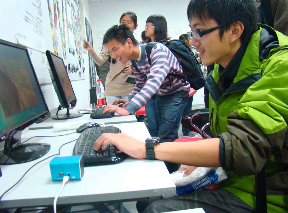 讲座过后便是轻松欢快的参观环节。本次开放日展览集中展示了本科08级数媒专业学生的作品,同时也有部分07级和09级同学的作品。丰富多彩、形式多样的作品引得同学们赞叹连连。参观过程以互动和自由的方式为主。有充满创意的益智游戏等着参观者体验试玩,有亦真亦幻的手绘美术作品和摄影作品等待着同学们欣赏体味,还有不间断循环播放的视频动画引得大家驻足观看。通过键盘、鼠标、方向盘、KINECT等多种交互技术的运用,参观的同学们在实际体验、切身感受的过程中体会到了数字媒体技术的独特魅力。