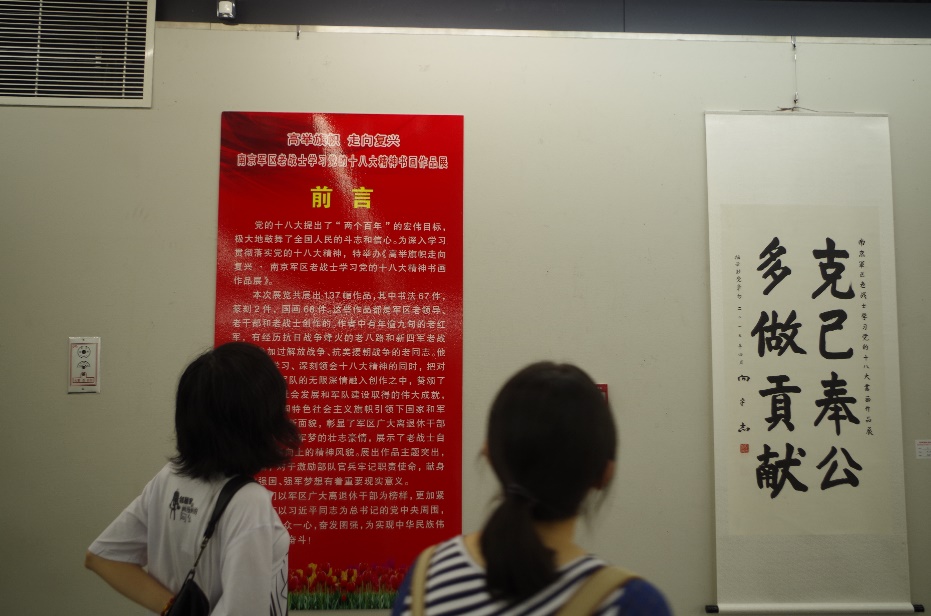 我们参观书画展的一大感受是,老战士们很多都怀着一种“老骥伏枥,志在千里”的壮志,从他们的作品中可见一般。如很多作品中都有猛虎这一形象,还有不少书画作品中有例如“剑气、忠心、壮志”之类的词语,令人肃然起敬。