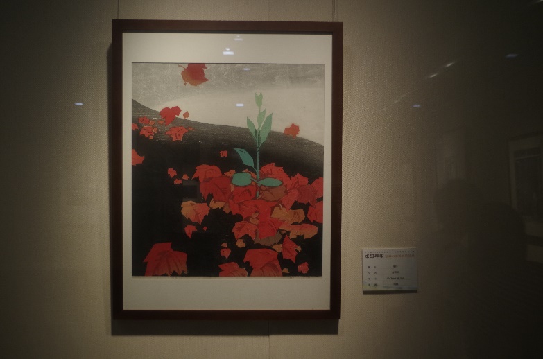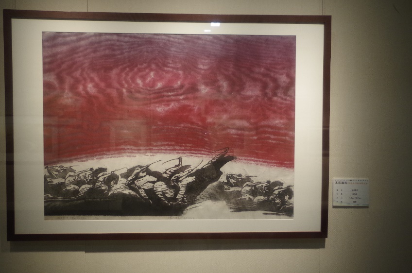 之后我们参观了位于3楼的水印版画展。基本都是上世纪八九十年代的作品,有浓重的年代印记。其中有很多很不错的作品。例如《车桥歼寇》、《保卫黄河》、《落叶》等。《保卫黄河》是一片血红色的背景,前面是黑色的士兵。黄河已被战友的鲜血染成了血色,而战士们却依然前仆后继地奋勇向前。这时候回想一下黄河大合唱的歌词和曲调,瞬间有一种崇高的感悟与敬重。我们现在的安逸生活正是前人抛头颅洒热血换来的,血流成河却不带一丝犹疑的坚定向前,多么可歌可泣的勇士!还有一些版画表现了工人的劳作场景,用细致入微的笔法刻画出工人的脸庞,反映出当时的劳作场景。还有一幅名为《落叶》的版画,灰暗的大背景下一整片鲜红的落叶。在死寂中一颗绿色的植物倔强地在不适合的世界中升起。冲突的美给人震撼,这就像是一切新事物的诞生,如此倔强茁壮又充满危险,血色的落叶培育了幼芽,一如过往战士用鲜血换来今日太平。而冉冉生起的幼芽正如今天蓬勃向上的新中国,充满生命力!