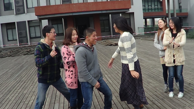 在情人坡拍摄完了大部分的场景之后,同学们转战到了医学院二楼露天阳台,拍摄了一段名为“贴膏药”游戏的素材,以展示欢乐和谐的班级气氛。