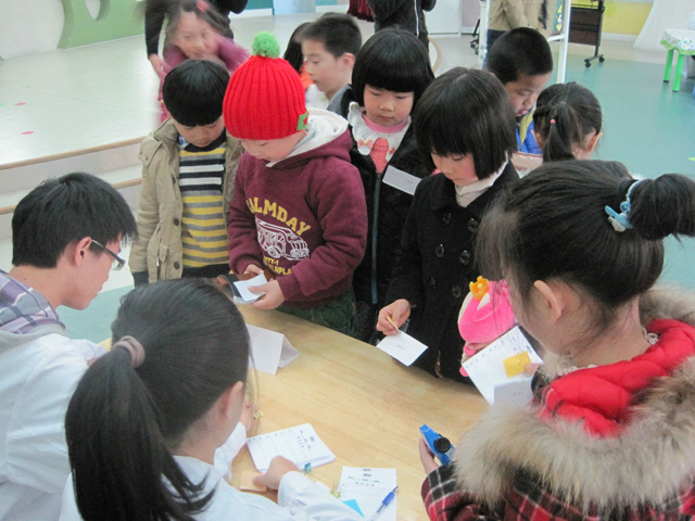 由于幼儿园的小朋友们年龄较小,在游戏开始前同学们耐心向小朋友形象地介绍了每个部门和看病的流程。小朋友们十分配合,眼眸中是掩饰不住的跃跃欲试;介绍的话音刚落,小朋友们就迫不及待的跑到前台抽取病症和领取“钱”。然后,他们带着自己的“宝宝”,根据病症去相应科室“看病”,不多时,各个科室便排满了来给“生病”的玩具们看病的小朋友们。小朋友们的参与积极性很高,与同学们配合融洽,每个环节都进行的有条不紊。
