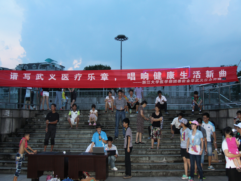 2012年7月5日北京时间18点整,浙江大学医学部医学部赴金华武义暑期社会实践队在武义县政府的支持下,以“谱写武义医疗乐章,唱响健康生活新曲”为主题的小型宣讲会在武义县滨江广场成功举行。宣讲会分三个部分进行:浙江大学校史以及浙江大学医学院院史简介。