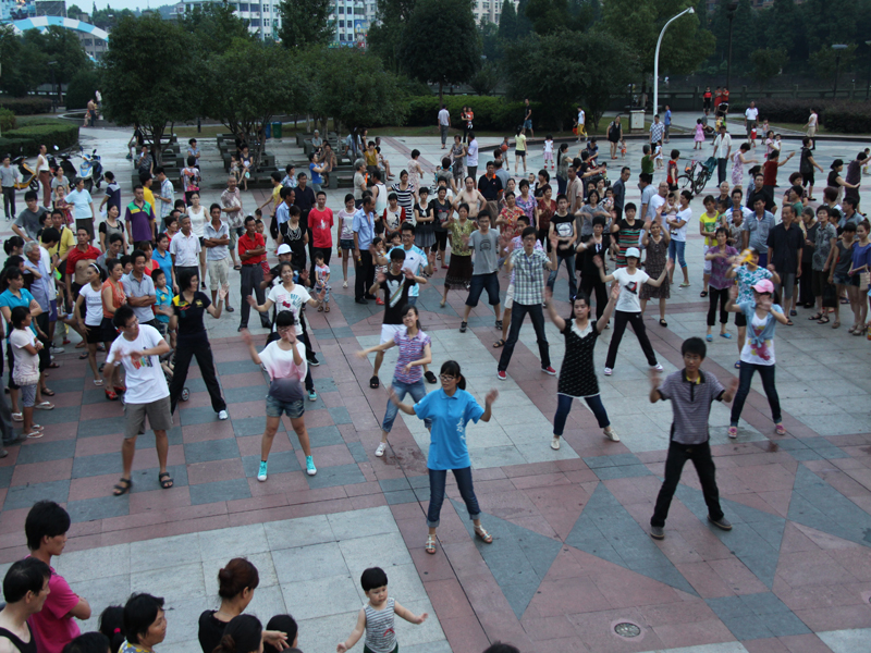 宣讲会的重要环节——带动广场市民一起跳健康操也随着《最炫民族风》活泼的音乐重磅出击。伴着节奏感强的音乐,社会实践队队员涌上广场,整齐划一地按照辛苦编排的舞蹈动作舞动起来。简单的动作,动感的节奏,宣讲会也随之进入高潮。在领舞的带动下,广场上的许多群众也参与其中。