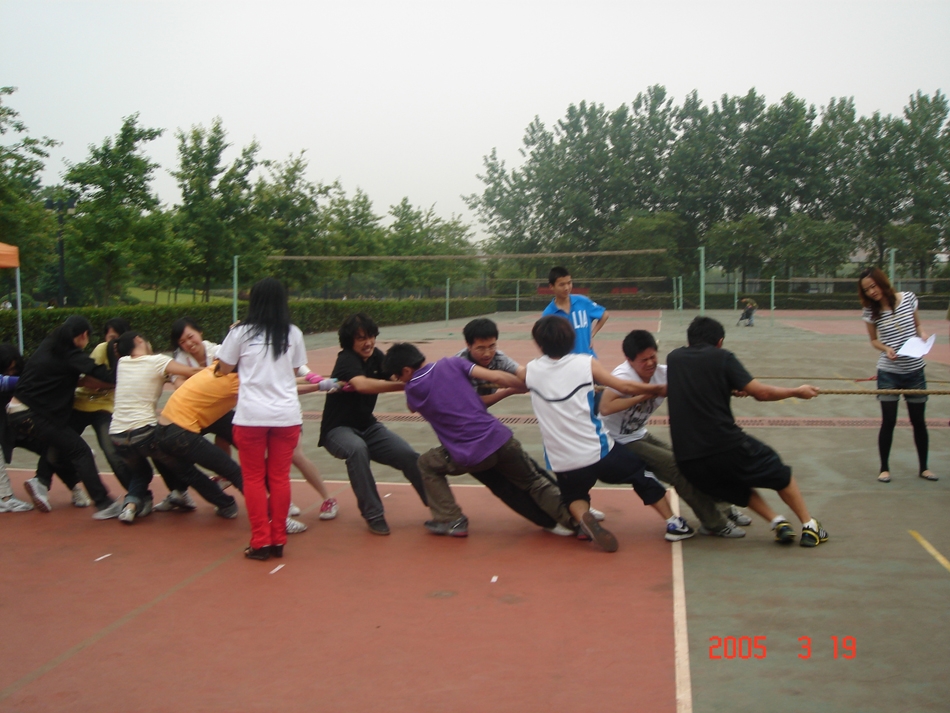 拔河比赛是丹青学园学生会品牌活动之一,深受学生欢迎,各个班级踊跃参赛。比赛前现场气氛已经很热烈,高潮迭起,参赛的同学摩拳擦掌,准备积极拼搏;啦啦队热情高涨,喝彩声从丹青广场到篮球场连绵不绝。比赛即将开始,队员们在裁判的指示下调整位置,严阵以待。随着裁判员哨声的响起,比赛正式开始。队员们全力以赴,自喊节拍,“一二三,一二三……”,把力量全部灌注在绳上,下压重心,向后再向后。队员们脸涨得通红,身体倾斜快躺倒在地上,手磨疼了却依然咬牙坚持,丝毫不放松。绳子在两个队伍的挣扎下来回移动,标志着胜利的红线也不断地拉锯。激烈角逐后,在欢呼声中胜负分晓。一场比赛下来,有的同学摔伤了,有的同学手掌皮被磨破了,可是他们仍然灿烂地对大家微笑,即使输了也在其中感悟到了“友谊第一,比赛第二”的精神。正如一位参赛同学所说,“我们都没有输,就算少了奖牌,我们也在汗水中被班级的凝聚力感动,收获并不比一块冠军奖牌少。”