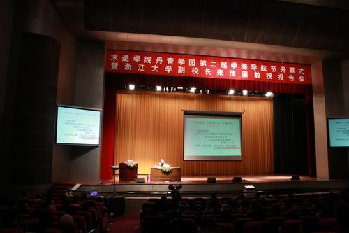 27日晚,由求是学院丹阳青溪学园所包含十八个专业学院联合主办的第二届学海导航节开幕式暨来茂德副校长《研究型大学的本科教育》专题报告会在紫金港剧场隆重举行。校党委学工部部长、求是学院党委书记金海燕,校团委副书记沈黎勇,光华法学院党委副书记张子法,化学系党总支书记马晓微,数学系党总支书记卢兴江,教育学院党委副书记王珏,药学院院长助理、党委委员刘伟,求是学院丹青学园党总支书记楼仁功等领导和嘉宾出席了开幕式。活动由求是学院丹青学园党总支副书记沈燎主持。